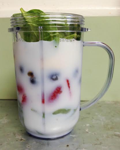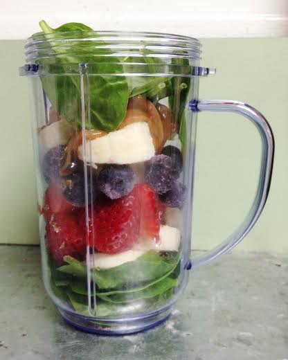 You should have a vibrant, beautiful layer of fresh fruits and spinach in your blender/Magic Bullet cup, like this: