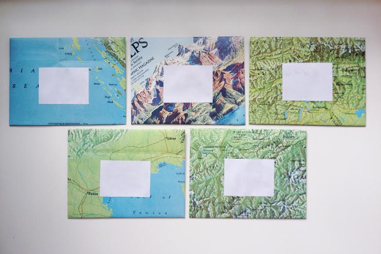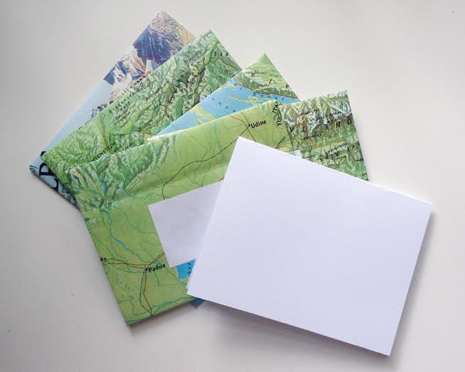 The first set is made from vintage National Geographic map scraps (courtesy of MaryAnn of Life is a Maker Faire) leftover from the Etsy Craft Party.