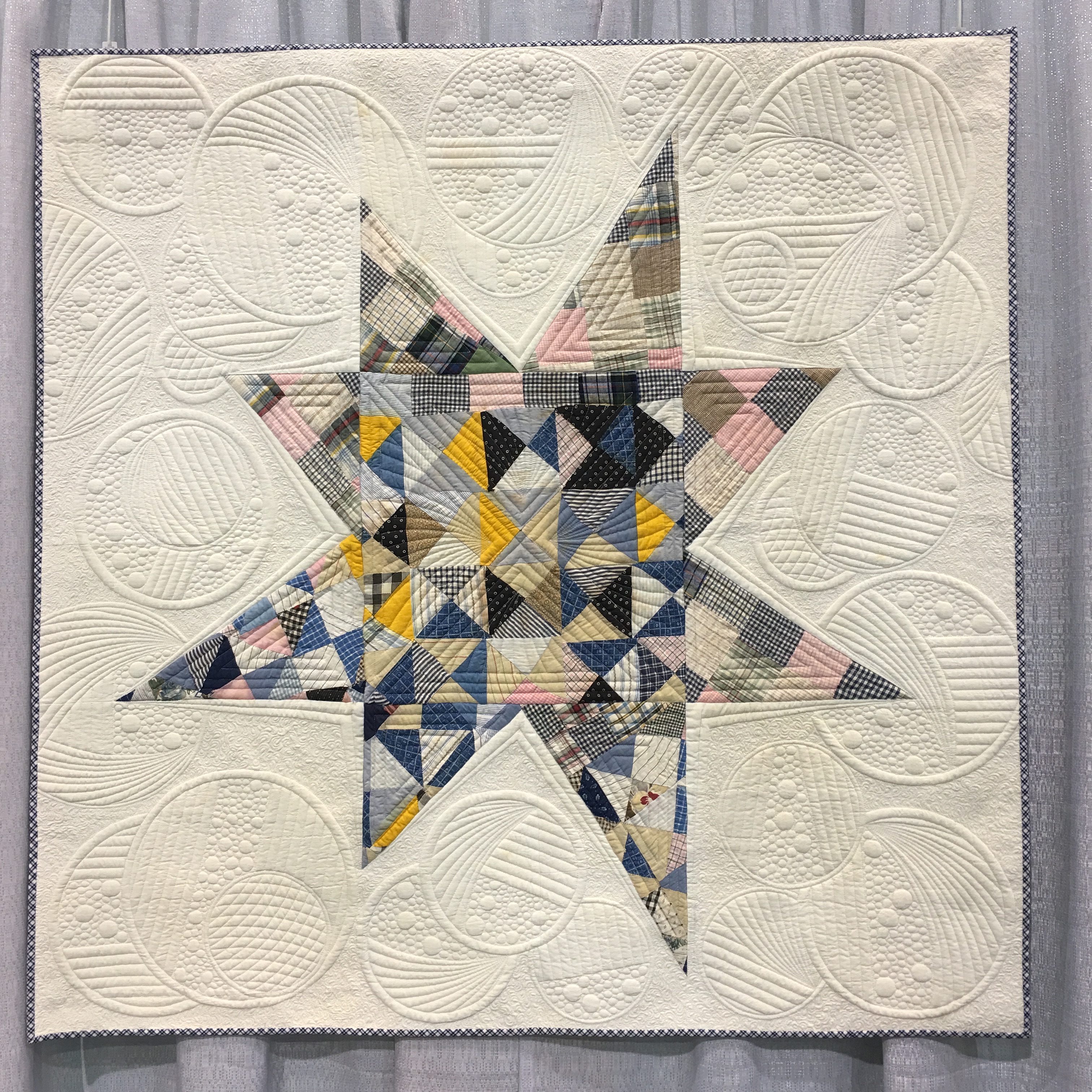 “This wonky star began its life as a piece of worn vintage top. By individually piecing the star points I was able to cut around the damaged areas and reinforce the fabrics as needed. The star is set with vintage muslin and bound with homespun fabrics from 1900. I did not attempt to remove the areas of discoloration. I feel they add to the Homespun feel of this quilt …the grey hair and wrinkles of our textile world. Donna James’s quilting perfectly compliments this off kilter star!”