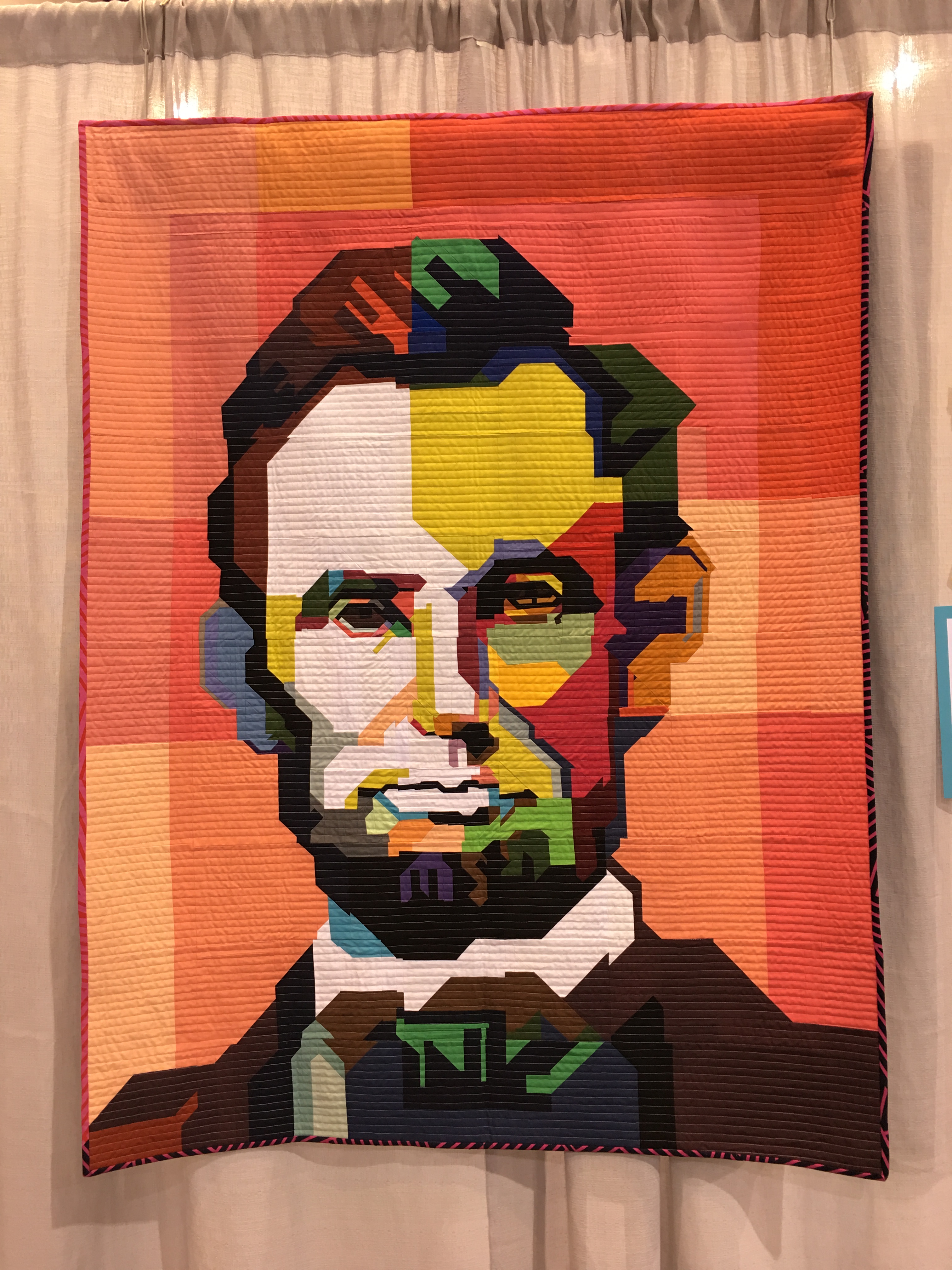 “This quilt (passion project!) developed out of a desire to create an entirely improv-pieced, recognizable image without use of template, paper-piecing, or applique. Using an iconic image of Lincoln that had been converted to WPAP (vector-based geometric pop art) by Ihsan Ekaputra, it was constructed using 6-inch blocks. The backing fabric is a repeating pattern of the original image of Lincoln. The binding is a nod to the vector-style of art on which the quilt is based. The end result is a quilt that is both identifiable as the intended image, and distinctly my own.”