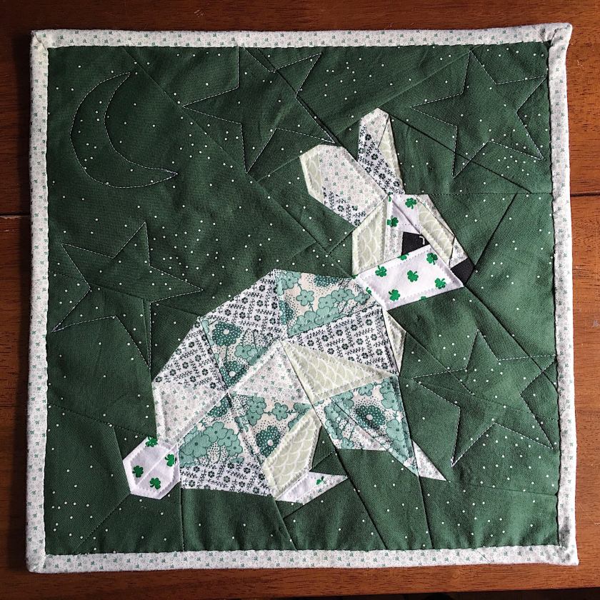 When I started Mr. Bunny at QuiltCon in the spring, I didn’t know exactly what adventures were ahead of him. After sharing him with my quilt guild, they suggested submitting him in the upcoming two-color challenge [since he’s only one color: green]. The challenge entries will be displayed in an exhibit at our local library in the coming weeks.