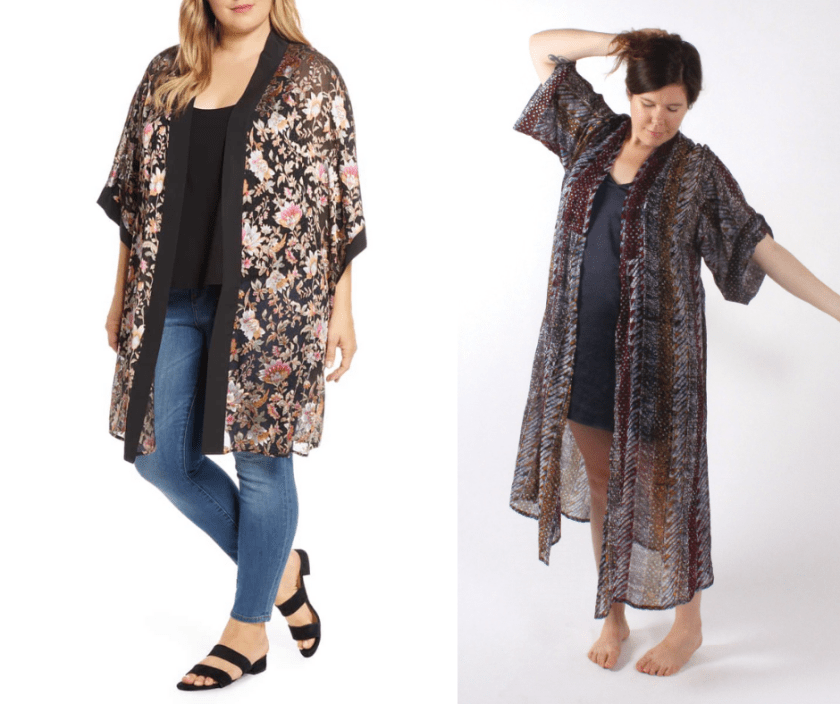 Using a lightweight woven fabric, make yourself a Suki Robe. Unless you plan to tie it, you can omit the waist ties and loops. You can use this tutorial to extend the front band to match the RTW sample above. You may also want to shorten it using these instructions.