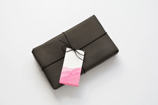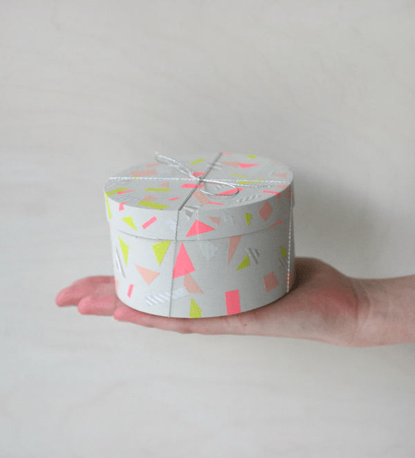 Decorate a plain box or upcycle an existing box (if you can’t get all the labels to peel off or it’s printed, cover it in plain packing paper) with bits of washi tape stuck around the box like confetti.