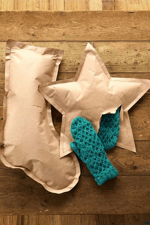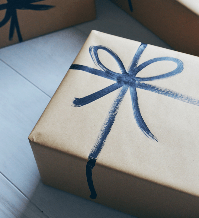 Upcycle some packing paper (or use a Kraft roll*) to wrap gifts – you can paint a ribbon on like the photo below or paint a design on the paper before cutting to wrap.